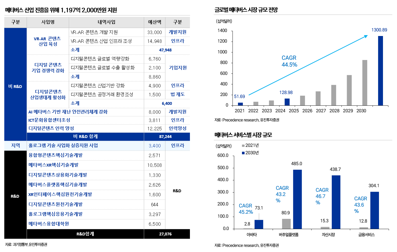 실제로 정부와 빅테크를 중심으로 글로벌 표준 수립 및 생태계 확장이 활발히 진행되고 있습니다. 국내에서도 정부 주도로 메타버스와 XR 기술 생태계 확장에 적극적인 모습을 보이고 있는데, 세계 최초로 메타버스 산업 진흥법이 제정되어 8월 말부터 시행될 예정이며, 과학기술정보통신부에서는 메타버스 산업 진흥을 위해 올해 1,197억 원을 지원하겠다고 발표했습니다.