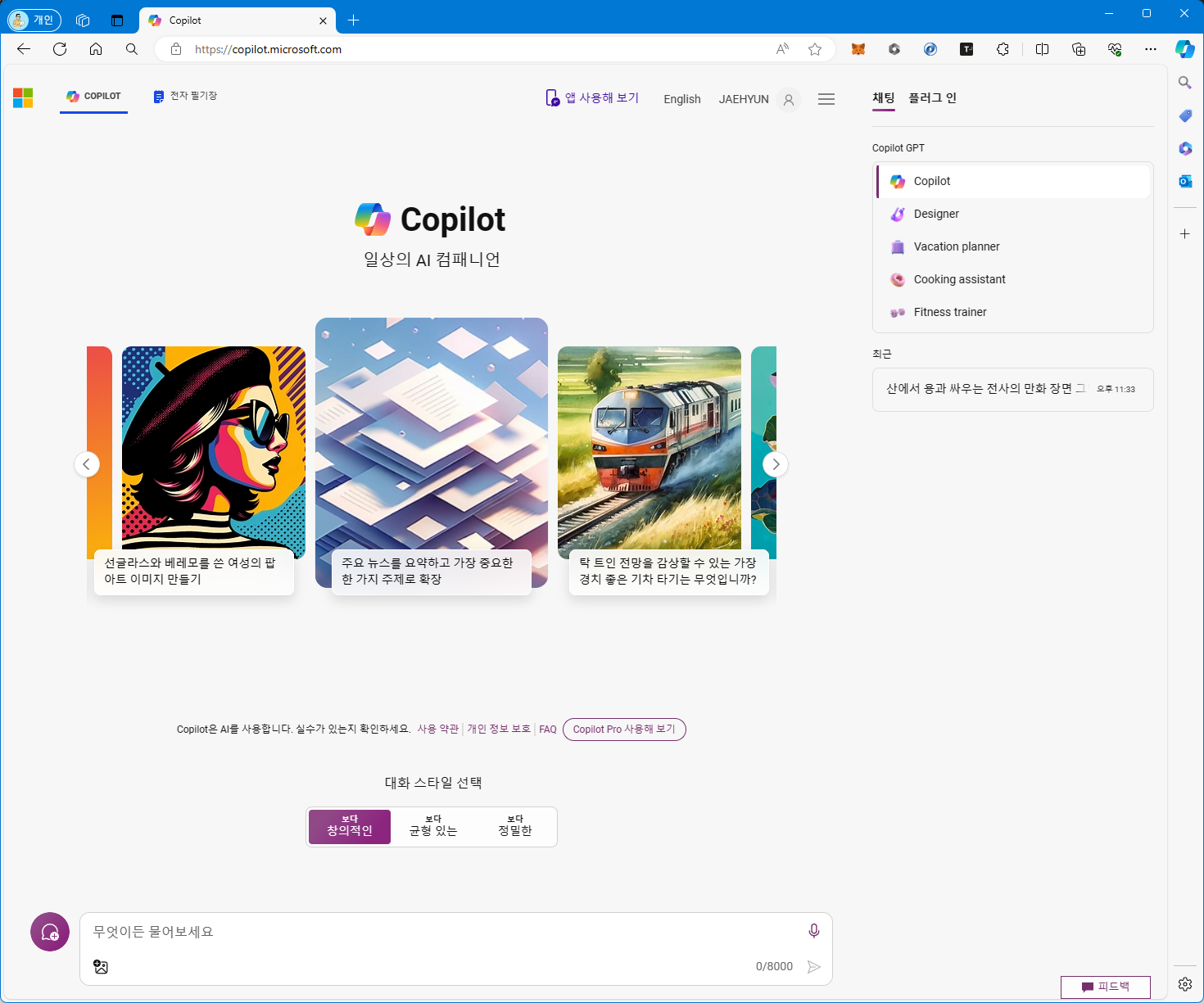웹에서 코파일럿을 사용하기 위해서는 마이크로소프트 엣지브라우저, 크롬브라우저로 아래 URL로 접속해서 사용할 수 있습니다.